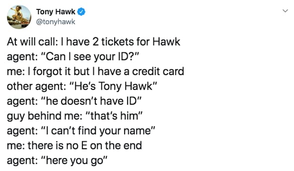 Source: static.demilked.com But skating legend tony hawk doesn't have this problem. In one tweet, he claims a car rental worker deleted his reservation because they thought the name tony hawk was fake. In the past, he's gone viral for his tweets regarding his mundane interactions, which usually end with people failing to register that he's the real tony hawk. And all of these people are better than this guy, who actually did recognize tony hawk and still found a way to be rude about it
